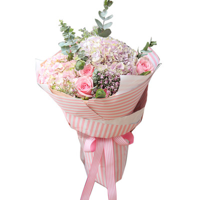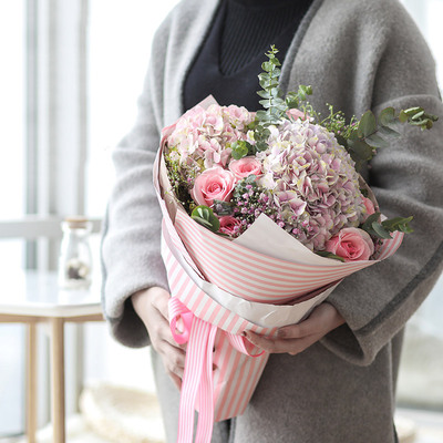 粉色条纹纸包装搭配粉色条纹缎带系结束扎花语:你的微笑藏在我心里,春风吹我为你动了情,明月照我思念着你,往事历历在梦里,今生注定爱着你,真心真意永不分离。附送: