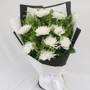 白色、黑色硬包装纸扇形包装,白色缎带系蝴蝶结束腰。花语:无论多长时间,我们永远不会忘记你。附送: