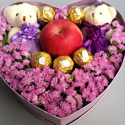 粉色满天星,5颗费列罗巧克力,1个苹果,2只小熊