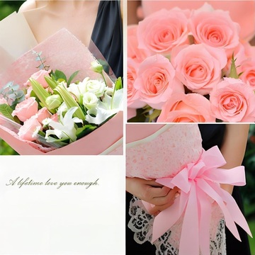 粉色与白色包装纸相搭,扇形包装,搭配精美花结。花语:把清清浅浅的心事悉数写进记忆的书卷,不求华丽,只要一份简约,让恬淡驻扎在心里附送: