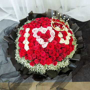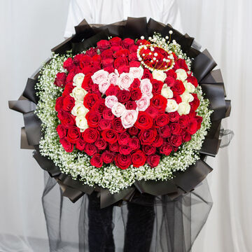 99支混搭玫瑰(香槟和粉玫拼字IOU),白色满天星丰满围边,一个皇冠