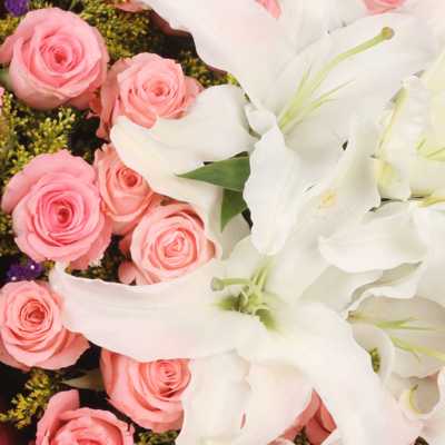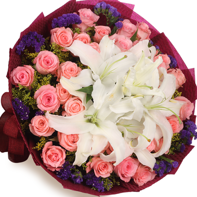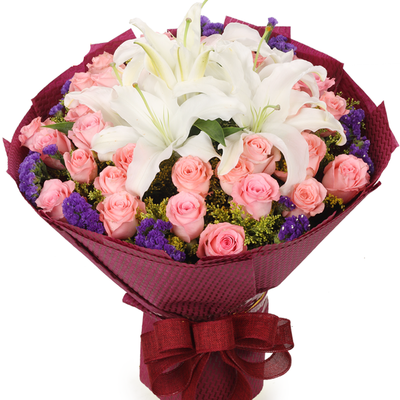 精选33朵戴安娜粉玫瑰,2支多头香水白百合,搭配黄莺、勿忘我间插点缀。