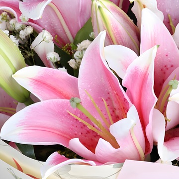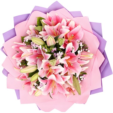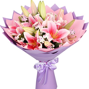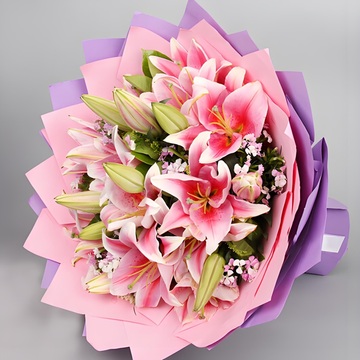 16朵粉百合,相思梅、黄莺、栀子叶搭配。