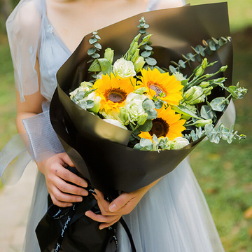 内衬黑色雾面纸,外层黑色厚牛皮纸扇形包裹,黑色英文丝带束扎花语:岁月悠长,温暖如斯。喜欢你你脸上挂着的盈盈笑意,因为那像阳光一样,充满了我整个心窝....附送: