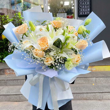 11支香槟玫瑰,3枝多头白百合,搭配适量白色洋桔梗、白色满天星丰满