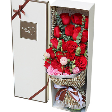 19朵红玫瑰,2枝粉桔梗,尤加利叶间插(没有用栀子叶代替)