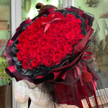 黑色雪梨纸内衬,外层红色欧雅纸圆形包装花语:允许我在你心里建一座美丽的小屋,千万别理会别人说是违章建筑。附送: