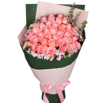 墨绿色包装纸扇形包装,粉色包装纸束腰,粉色缎带束扎。花语:浪漫一刻的守护,见证爱的真谛!附送: