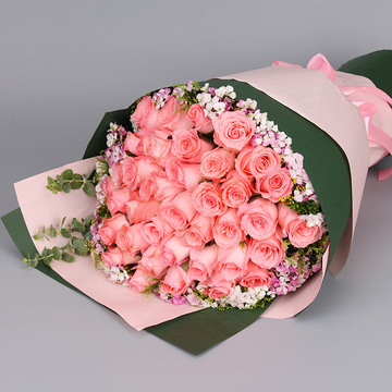 精选33朵戴安娜粉玫瑰,搭配石竹梅、尤加利叶。