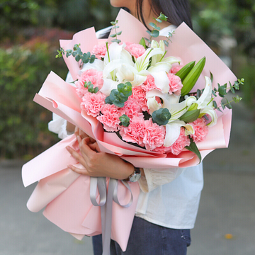 19朵粉康,2支多头白百合,尤加利搭配