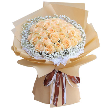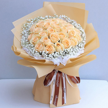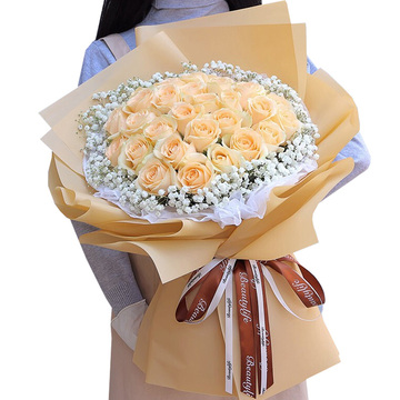 内衬白色雪梨纸,外层黄色韩素纸多层扇形包装,咖啡色缎带束扎花语:你是我生命的北极星,有了你,我再也不会在茫茫大海上迷失航向。附送: