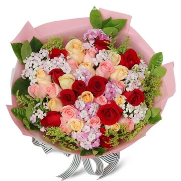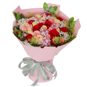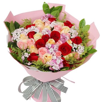 33朵红色、粉色、香槟玫瑰混搭,搭配石竹梅、黄莺。