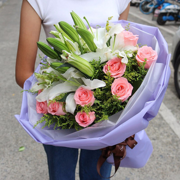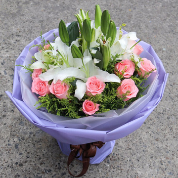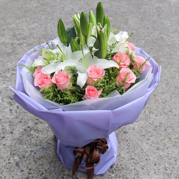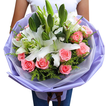 11朵戴安娜粉玫瑰,3枝多头白百合,黄莺丰满间插
