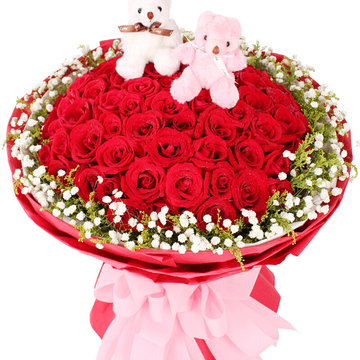 99枝红玫瑰,黄莺、满天星外围,随机赠送两只可爱小公仔
