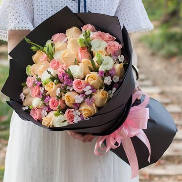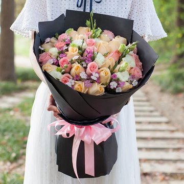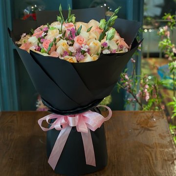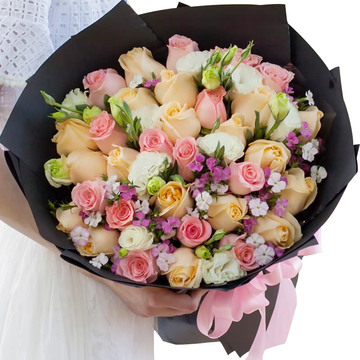 黑色牛皮纸圆形包装,粉色缎带束扎。花语:很爱你,想把你捧在手心,放在心里,纵然途中万般风景,我的眼里只有你!附送: