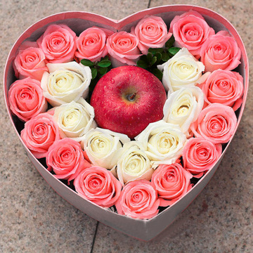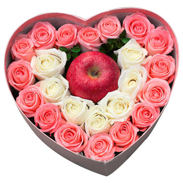 16朵戴安娜粉玫瑰,7朵白玫瑰,绿叶搭配,1个平安果中间装饰
