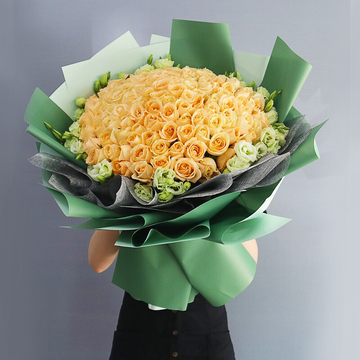 银色金葱纸+绿色欧雅纸包装,缎带束扎花语:爱上你就像牛奶爱上了面包,天生就一对遇见了再甩不掉附送: