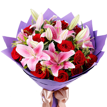 11枝红玫瑰搭配3枝多头粉百合,黄莺间插。