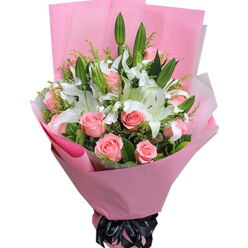 白色雾面纸和粉色欧雅纸扇形包装,黑色英文缎带束扎花语:美人如诗,一诗一美人,便胜却人间无数!附送: