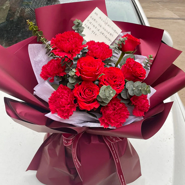 红色欧雅纸圆形包装花语:来到世上就要先喊妈!长大成人就要回馈妈!高兴快乐就要告诉妈!奋斗打拼就要想起妈!母爱伟大就要祝福妈!附送: