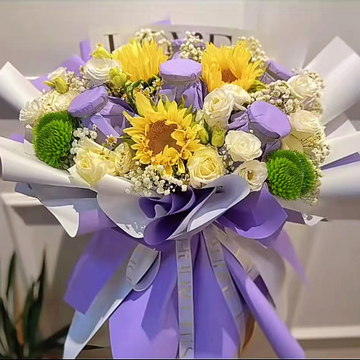 9朵白玫瑰3支向日葵,6瓶桃罐头,3支白桔梗,白满天星和绿雏菊搭配