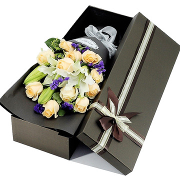 11朵香槟玫瑰+2枝多头白百合,搭配黄莺、勿忘我、栀子叶