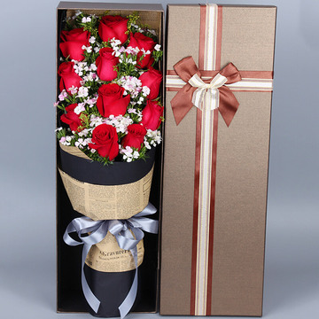 黑色牛皮纸加复古英文报纸扇形包装,银色缎带束扎。长方形礼盒装(礼盒颜色随机发)花语:一生也就七八十年,剩下的余生,我陪你。附送: