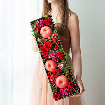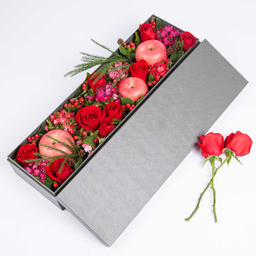 精品红苹果3个,卡罗拉玫瑰9枝,混色石竹梅7枝,红豆0.3扎,南洋杉叶适量