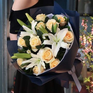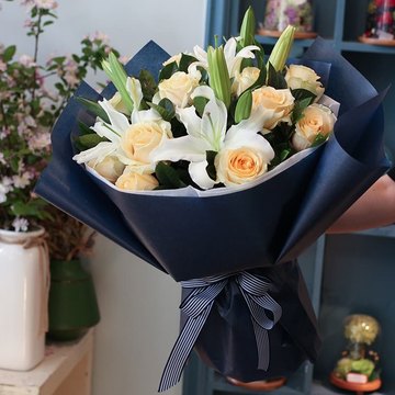 11朵香槟玫瑰+2枝白百合,搭配绿叶。
