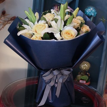 内衬白色棉纸,外层深蓝色雾面纸圆形包装,条纹缎带束扎。花语:时间在指尖中流逝,万物在雨露下滋长,星辰在昼夜里交替,我们在理想上行走,往我们珍惜眼前,相拥永远。附送: