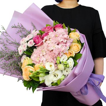1朵粉绣球,6朵香槟玫瑰,4朵苏醒,白桔梗3枝,粉色雏菊适量,情人草搭配,栀子叶点缀