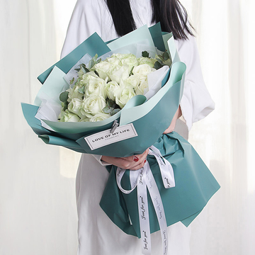 白色雪梨纸+绿色韩菲纸包装,白色英文缎带束扎。花语:手如柔荑,肤如凝脂。巧笑倩兮,美目盼兮。附送: