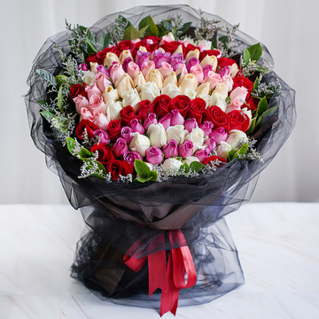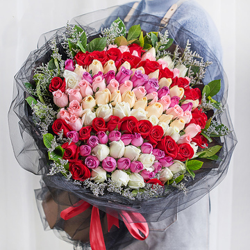 99朵混色玫瑰(红+白+香槟+紫),搭配情人草、栀子叶