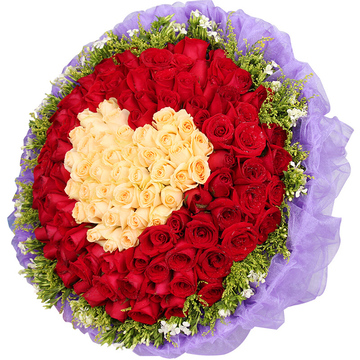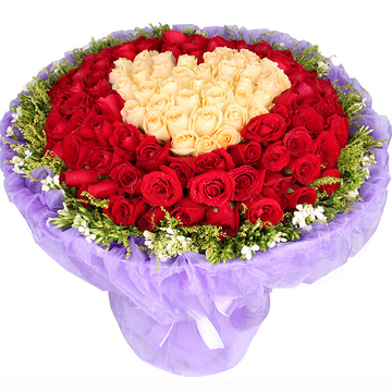 99朵红玫瑰和香槟玫瑰混搭,香槟玫瑰做成心形,外围白色相思梅和黄莺丰满围边