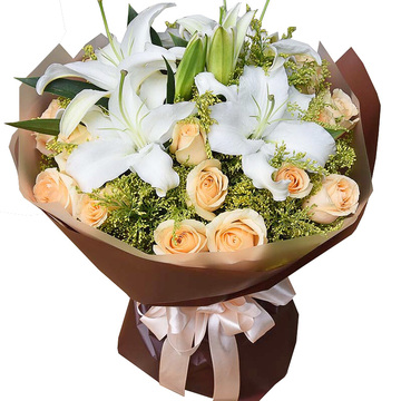 19朵香槟玫瑰,2枝多头白百合,黄莺丰满间插