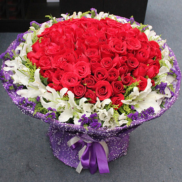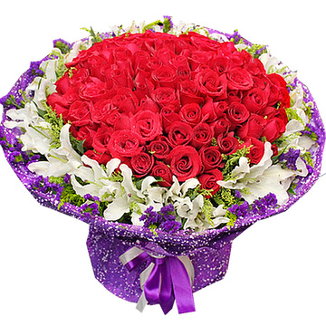 99朵红玫瑰,20朵白百合围边,勿忘我搭配,外围黄莺丰满点缀