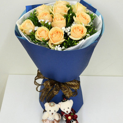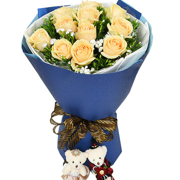 精选11朵香槟玫瑰,黄莺,满天星间插丰满,随机赠送小公仔一对