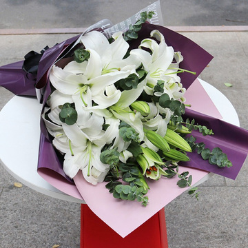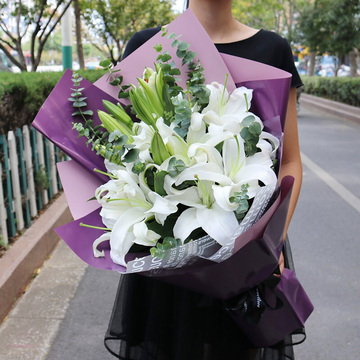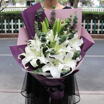 内衬英文雾面纸,外层紫色及淡紫色欧雅纸扇形包装,黑色英文缎带束扎花语:牵挂是最无私的思念,祝福最美好的话语,愿幸福伴随你!附送: