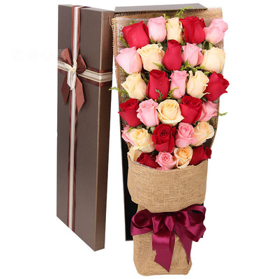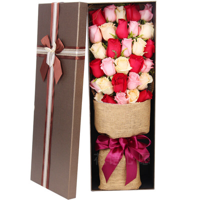 内层英文雾面纸,外层咖啡色细麻片包装,酒红色缎带束扎。咖啡色长方形礼盒。花语:于千万人之中与你遇见,与千万年之中,在时间无涯的荒野里,没有早一步,也没有晚一步,我们,刚巧遇上……附送:
