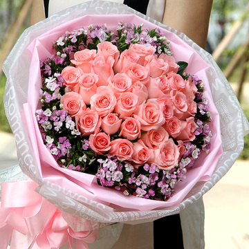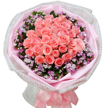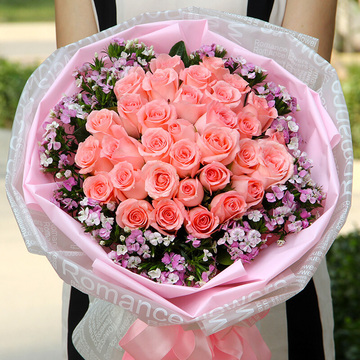 33朵戴安娜粉玫瑰,粉色石竹梅丰满间插