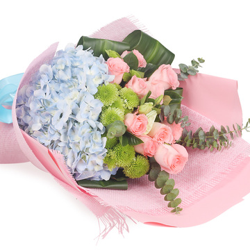 11朵戴安娜粉玫瑰,1朵蓝绣球,适量绿色小菊,1枝绿桔梗,3片巴西叶,尤加利叶点缀