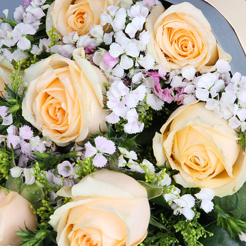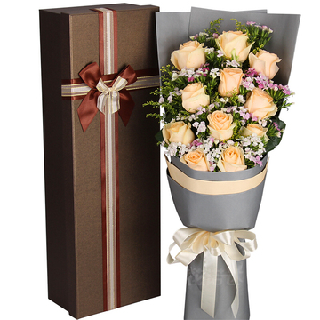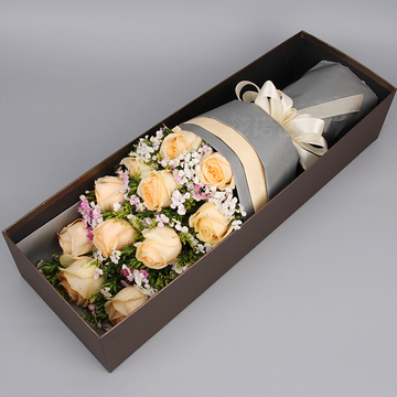 11朵香槟玫瑰,搭配黄莺、石竹梅。
