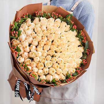 99朵香槟玫瑰,红豆丰满围边,绿叶搭配