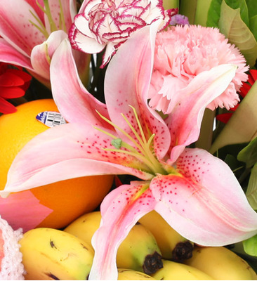 粉香水百合1枝,红掌1枝,红扶郎4枝,,粉康+紫康+紫边康乃馨间插,紫色勿忘我,搭配剑叶、栀子叶。菠萝一个,橙子2个,红苹果2个,香蕉一串。
