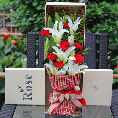 7朵红色康乃馨,4枝多头白百合,黄莺间插