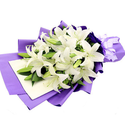 精选6枝多头白色香水百合,新鲜黄莺点缀。