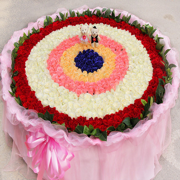 999朵混色玫瑰按图围成圈,栀子叶围边,一对情侣小熊