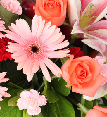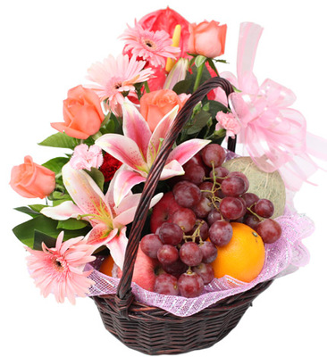 粉香水百合1枝,向日葵2枝,粉玫瑰2枝,红色扶郎9枝,粉色康乃馨+红色康乃馨间插,中间剑叶,绿叶适量;进口橙子3个,红富士苹果3个,进口红提1斤;