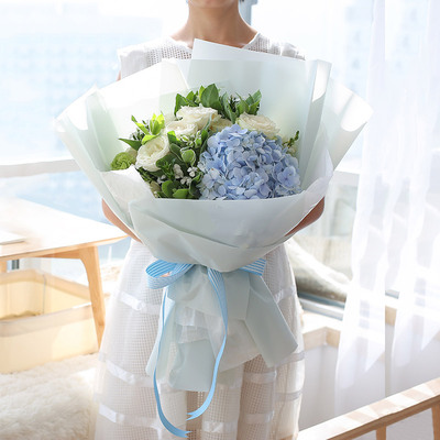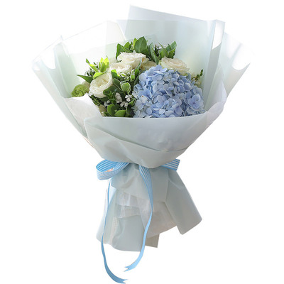 白色棉纸内衬,外层淡蓝色雾面纸包装,配蓝色条纹缎带系结束扎花语:我想要一辈子为你用尽我所有的好,不知道你是否能给我一次机会。附送: