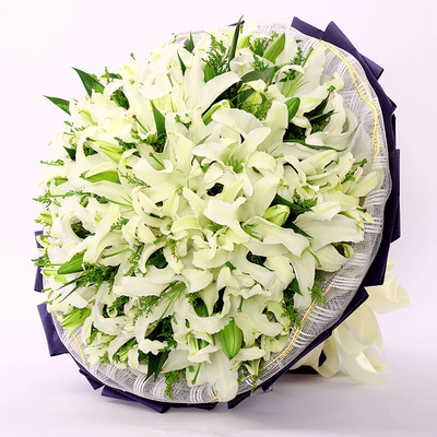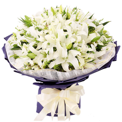 内衬白色金边纱网,外层深蓝色厚牛皮纸圆形包装,香槟色缎带蝴蝶结扎束花语:百合象征着干净、清冽,就如同我对你的感情,永远那么清新,不掺杂一丝杂质附送: